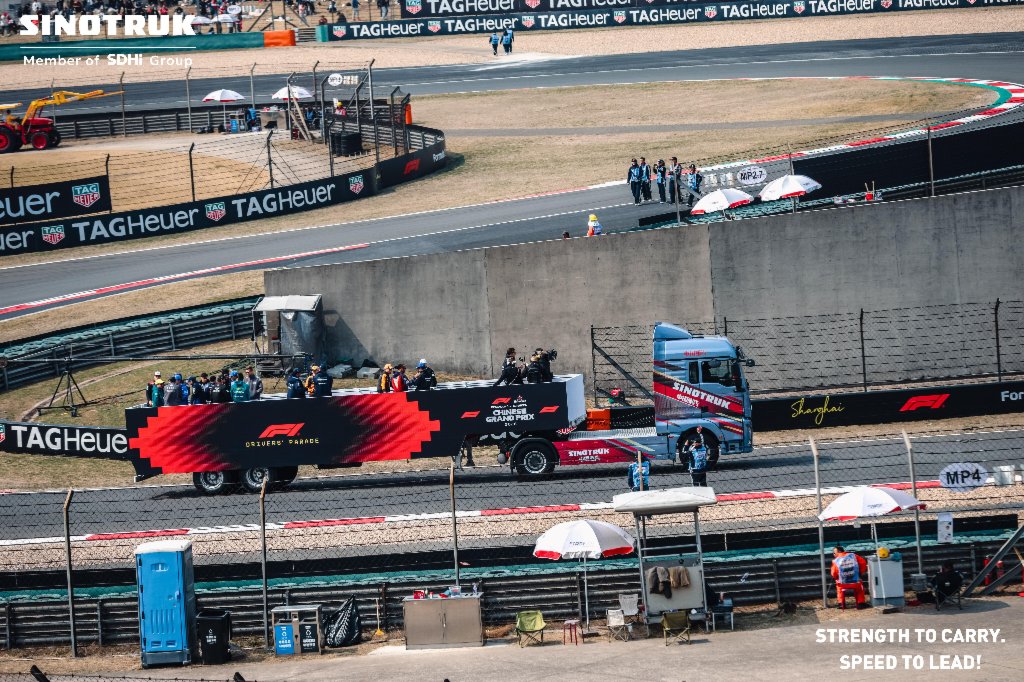 Moment fort du week-end : la Driver’s Parade, où quatre poids lourds Sinotruk ont défilé aux côtés des pilotes de F1. Habillés d’une livrée spéciale dédiée au circuit, ces camions ont attiré tous les regards. Le dispositif alignait : un SITRAK électrique, deux SITRAK diesel et enfin un HOWO TX diesel. Une image forte : celle de la puissance du transport routier face à la vitesse extrême de la Formule 1, un message qui a fait du bruit en Chine !
